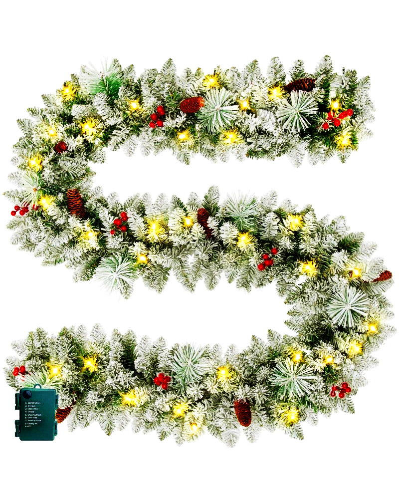 flocked Christmas Garlands PVC&Pine needles mixed,with 50LED lights 、red berries and pinecones
